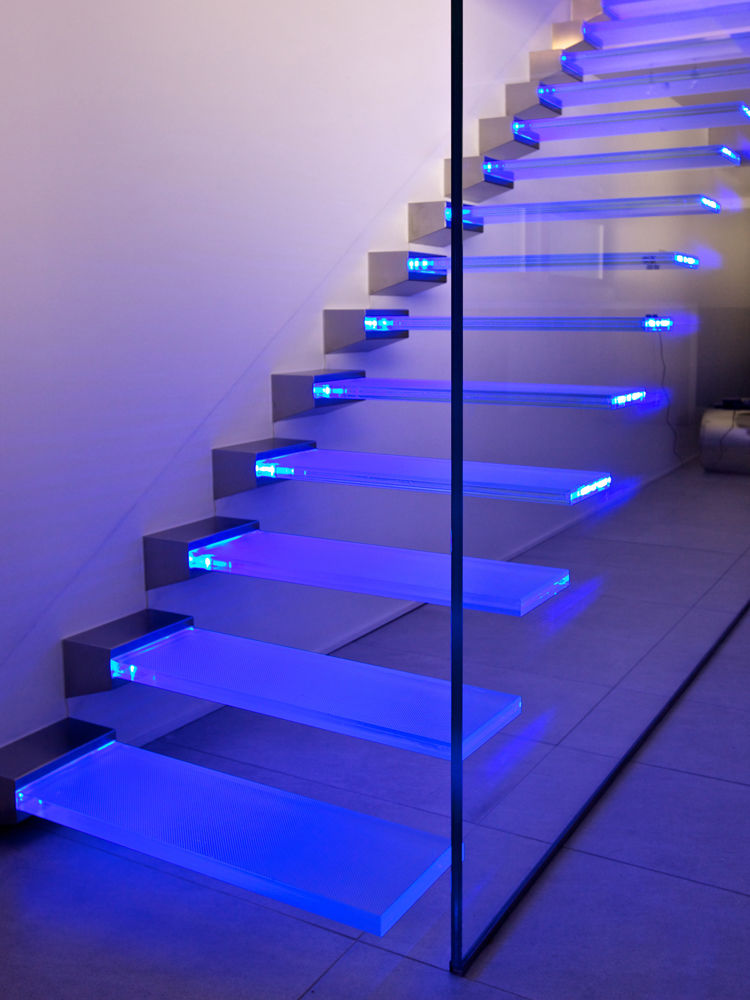 - Illuminare gli scalini in vetro, oppure i parapetti delle scale in vetro che rendono sicuro i percorso di notte oltre, ma sopratutto dei balconi per renderli visibili e illuminare il piano.