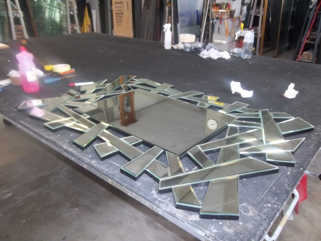 Nella foto sopra, la bisellatura e molatura riguarda tutto il perimetro del vetro grande e anche gli inserti color bronzo: nessuna cornice, tutto a vista.