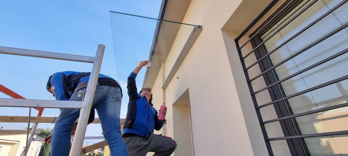 La tettoia in vetro così appesa è in ottima posizione per essere pulita e trattata con il prodotto antigoccia che fa sì che le gocce di acqua scorrano e non si attacchino al vetro.