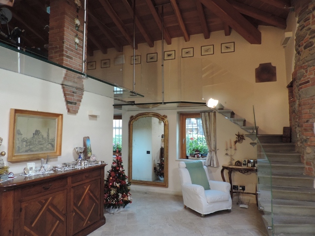 Soppalco con parapetti in vetro, balconcino con pavimento in vetro e parapetto, pavimento che è anche controsoffitto in vetro.