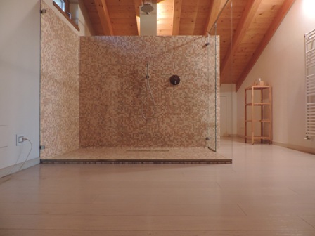 In contemporanea alla porta scorrevole in vetro satinato, abbiamo anche posato un box doccia in vetro extrachiaro solo fisso senza porta.