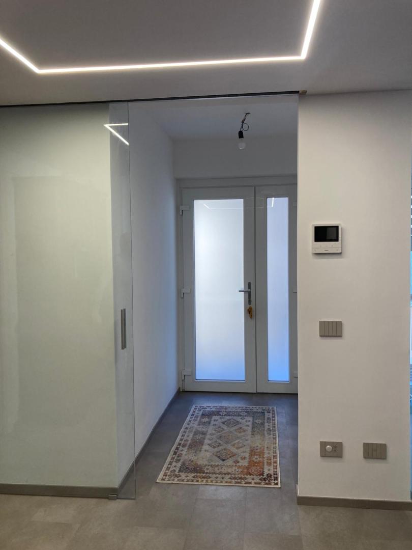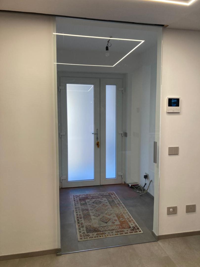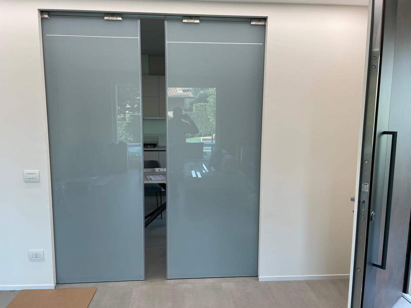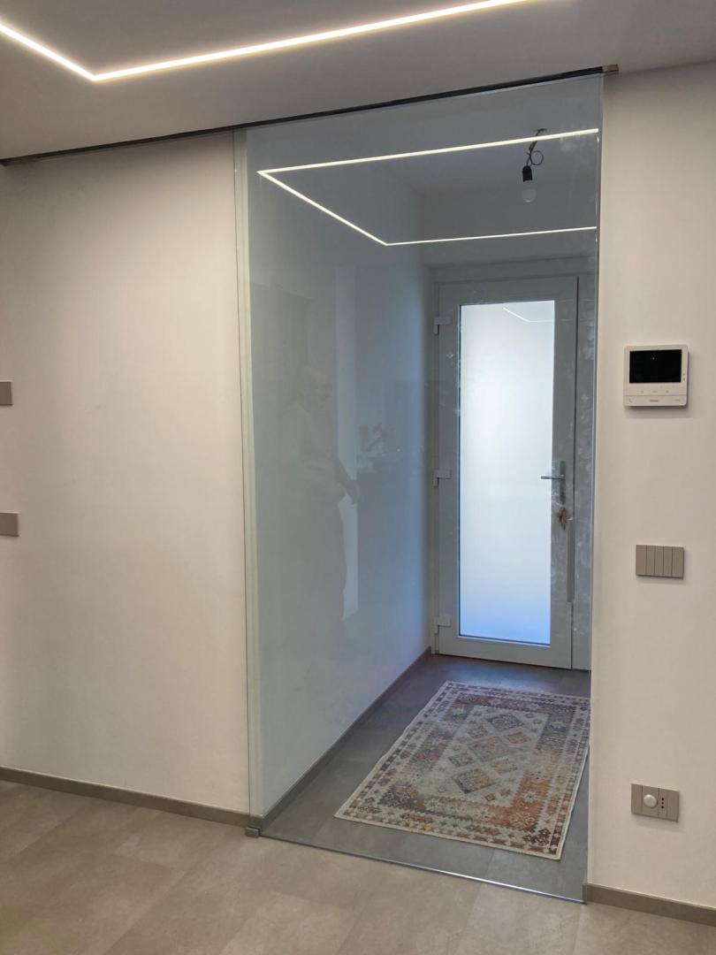 Esecuzione di porta scorrevole in vetro esterno muro con riloga in alluminio in Bergamo..