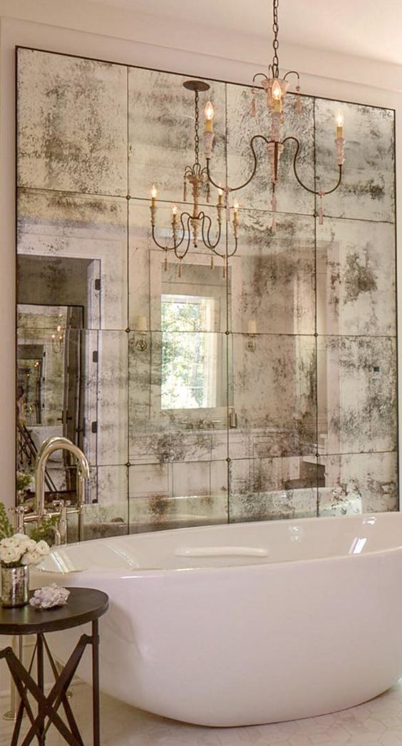 La cornice può addirittura essere fatta con altri specchi antichizzati: vale a dire lo specchio che serve è pulito mentre la cornice è composta di diversi specchi colorati e bisellati