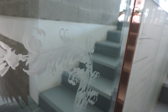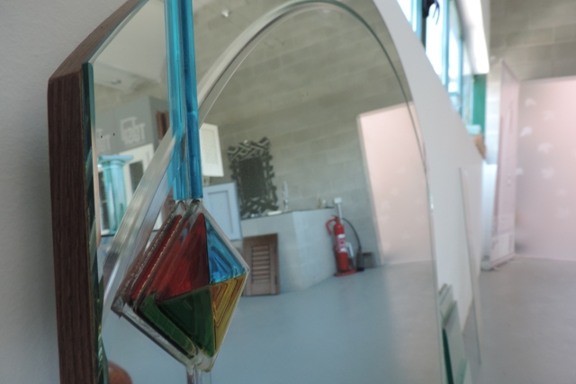 Nel nostro laboratorio abbiamo questo campione di specchio con incisione e inserimento di tessera in vetro.
