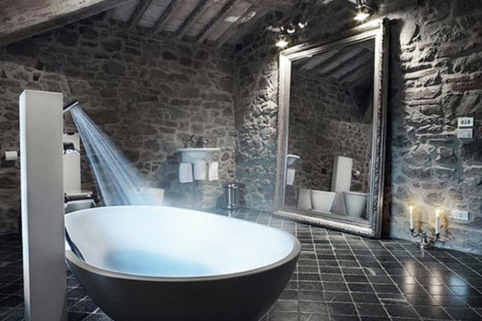 Una stanza da bagno così è fuori da ogni standard e lo specchio rispecchia la non normalità di un ambiente del genere.
