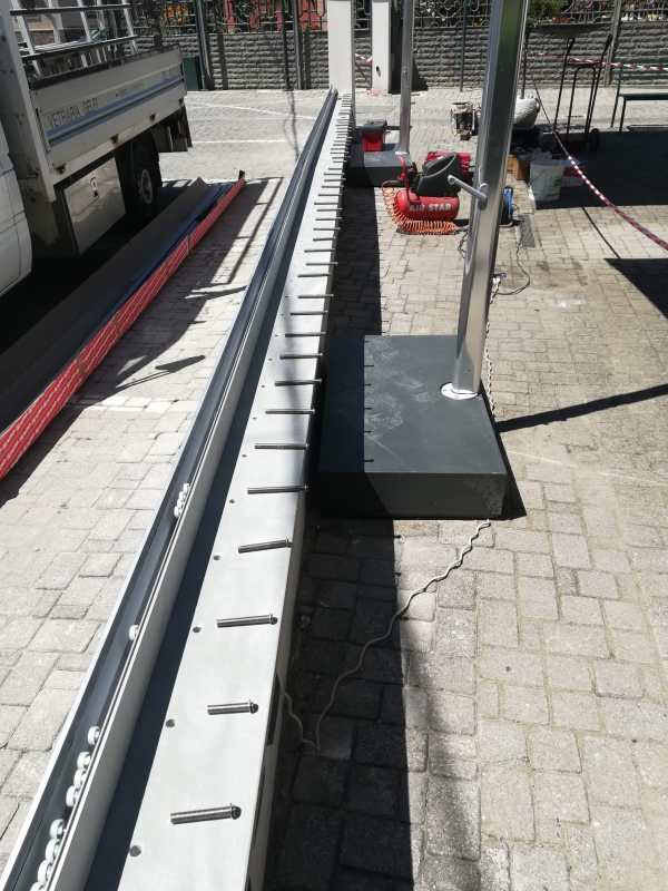 Come si vede la quantità dei fissaggi è dettata dalla certificazione per la sicurezza: tra i requisiti per produrre una posa certificata c’è una distanza ben stabilita che lo stesso costruttore dei profili ci indica pre-forando la barra di contenimento dei vetri stratificati: in questo caso 25 cm la distanza tra un bullone e l’altro.