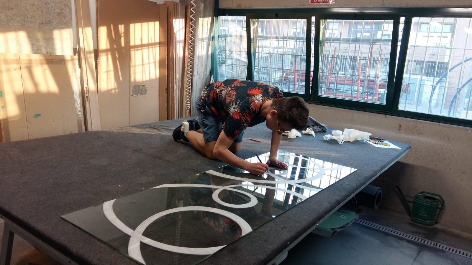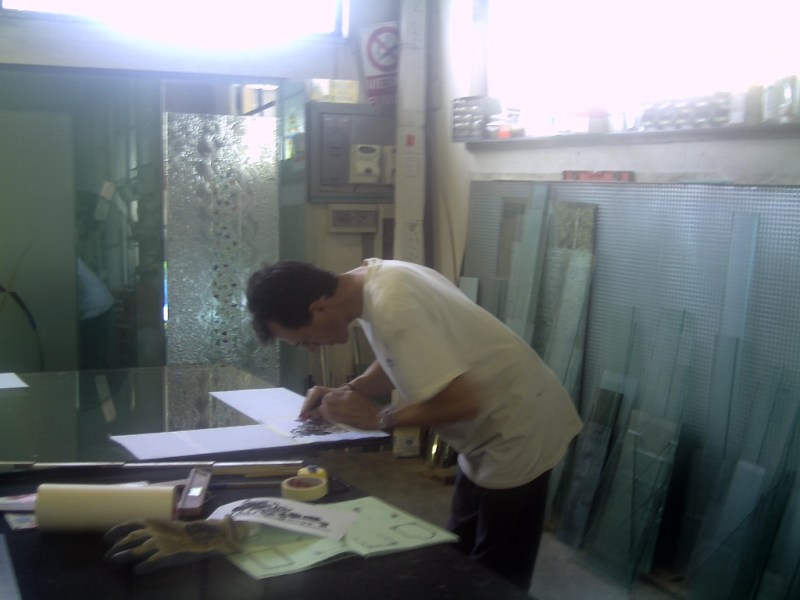 decorazione del vetro con la tecnica della smerigliatura in corso (ingrandisci)