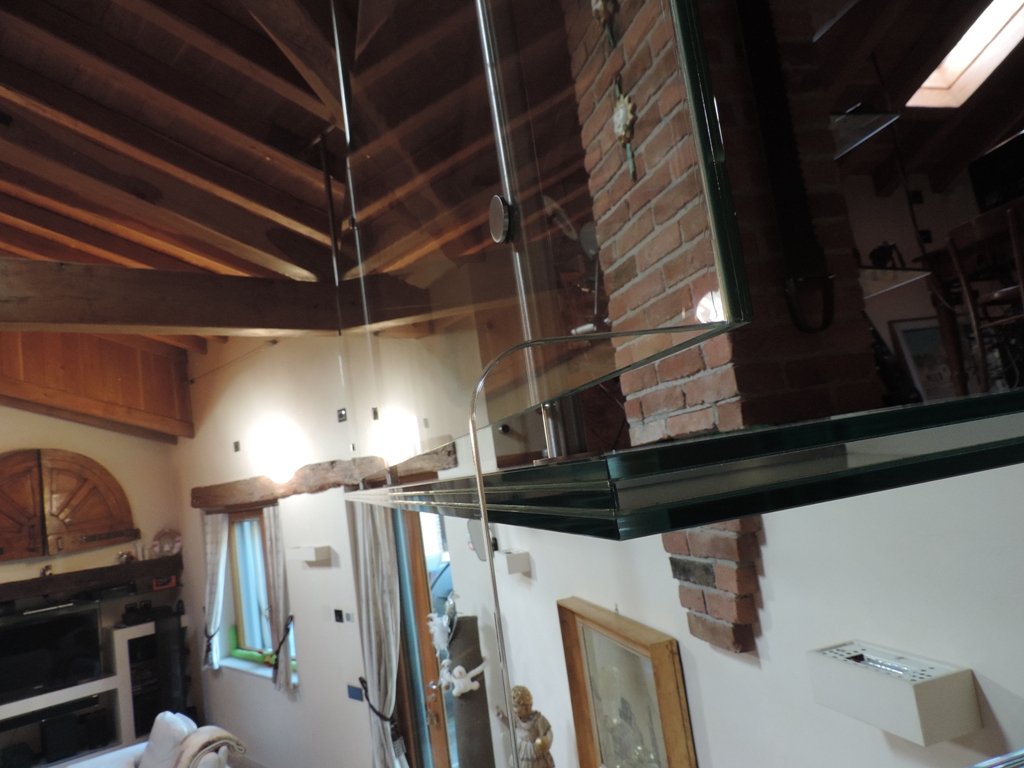 La realizzazione di questo soppalco prolungato con pavimenti in vetro, balcone in vetro, soffitto in vetro e parapetti in vetro è frutto di una bella comunione di intenti fra il committente, che da muratore esperto è anche il progettista e l’ideatore, e le capacità esecutive tipiche della Vetraria Gelfi che per tradizione esegue lavori su misura dal semplice vetro di una finestra a realizzazioni come questa.