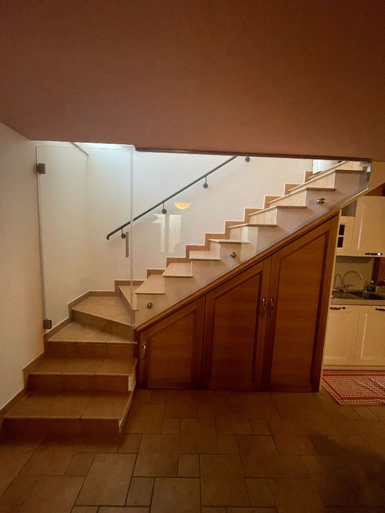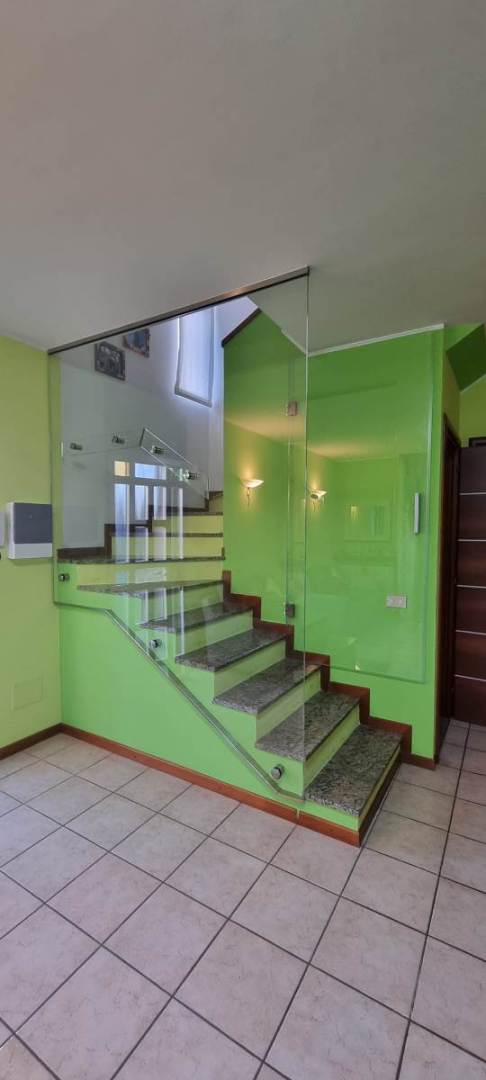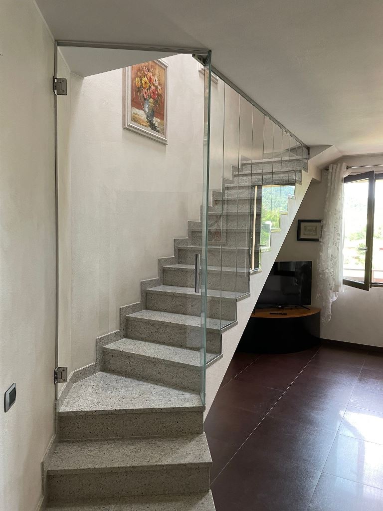 - Chiusura vano scala con parapetto in vetro a strisce e porta a vetro